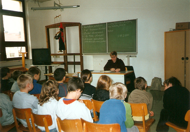 Der Ablauf meiner Lesung für die Älteren (3. bis 6. Klasse) gestaltet sich folgendermaßen: Ich lese den Kindern einige Textpassagen aus meinem Buch vor, um Ihnen Einblicke in den Handlungsablauf und den Schreibstil zu geben. Dies dauert ca. eine halbe Stunde und selbstverständlich werden die Kinder dabei miteinbezogen. Danach zeige ich mein Manuskript und veranschauliche anhand von Bildern, Auszügen aus den Korrekturfahnen usw. wie ein Buch entsteht. Im Anschluß haben die Zuhörer die Möglichkeit Fragen zu stellen und tun dies in aller Regel sehr eifrig. Aufgrund des Gesprächscharakters ist es sinnvoll, wenn nicht mehr als zwei Klassen an einer Lesung teilnehmen.